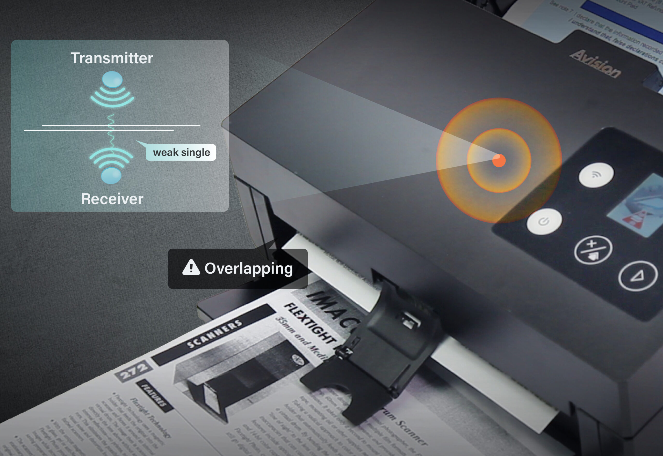 先进的超音波多张进纸侦测器,利用超音波技术侦测自动进纸器异常吸进两张以上文件的情形,一旦侦测到异常立刻停止扫瞄,并同步在计算机上通知用户发生多张进纸,如此可有效避免自动扫瞄过程中因进纸重迭而漏页扫描的事件发生,也避免事后必须再次重工的窘境。