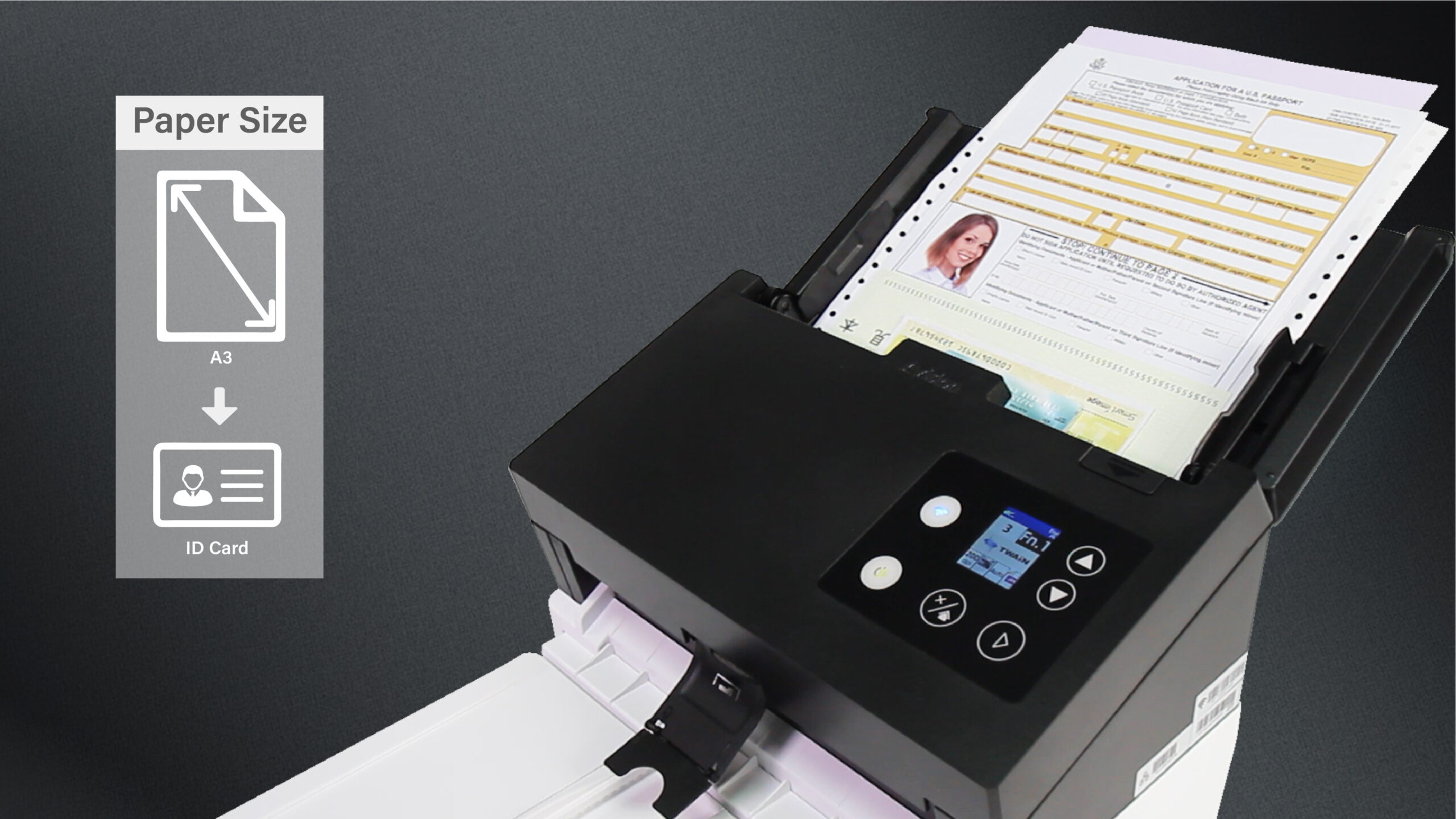 不同尺寸文件,大至A3小至名片尺寸,都可以轻松进行扫描,且混合扫描时无须再调整文件放置的顺序,如名片、凸字的信用卡、或身份证以及任何大小、长度的纸张,都可以不分先后的放置于ADF进纸器中。