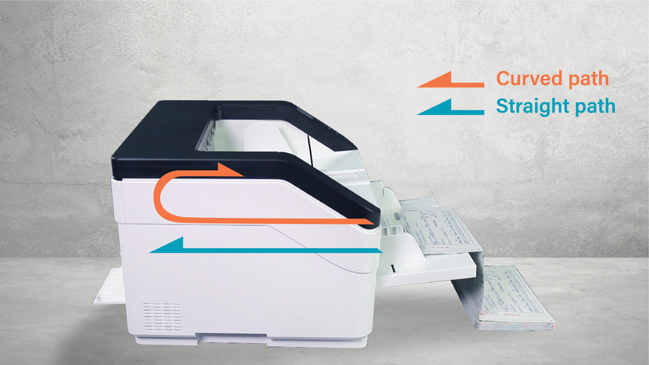 特定扫描机型提供弯曲以及直通式的退纸路径,让用户可以根据需求弹性地运用。选择笔直的退纸路径可以确保扫瞄有厚度的文件如塑料卡片、身份证,长页文件或是较薄文件时的稳定性与效率,让各种规格的纸张都能顺利进纸,避免文件遭机器曲折而损坏的风险。